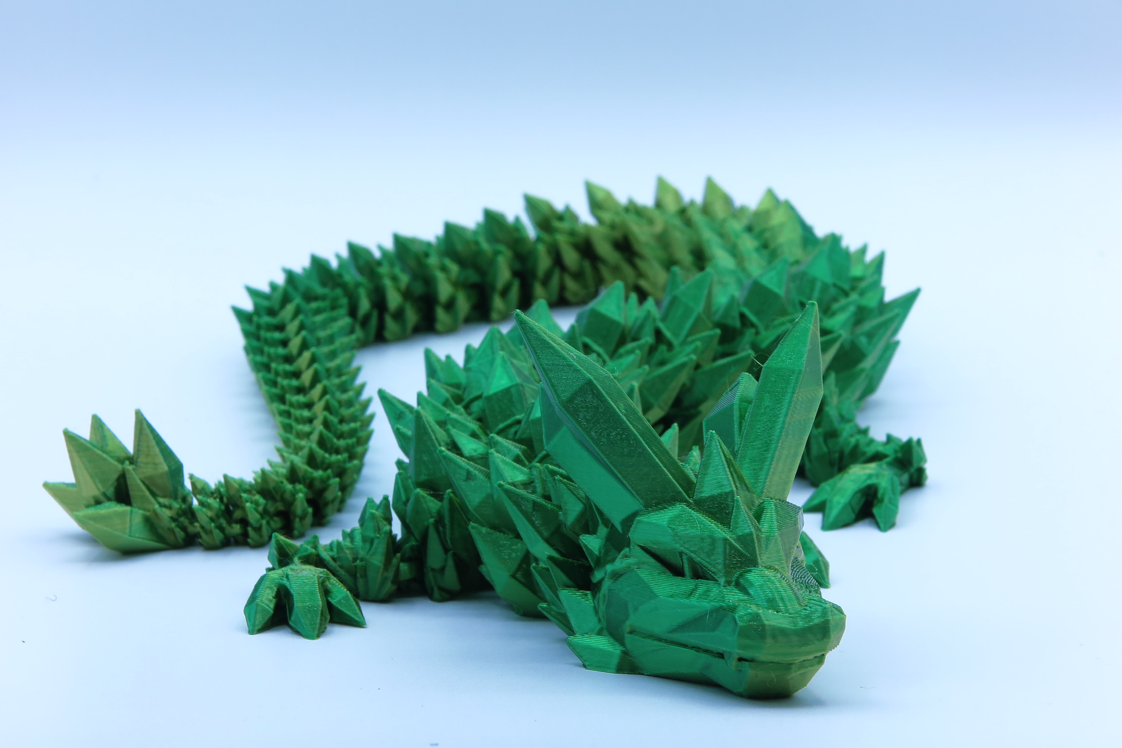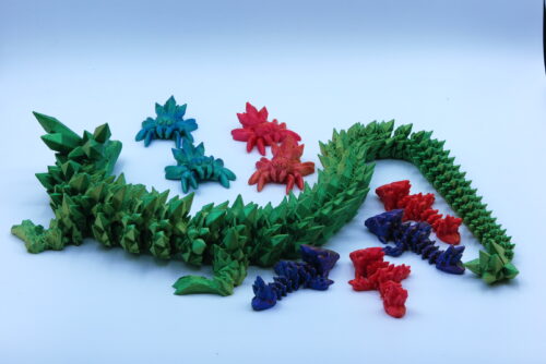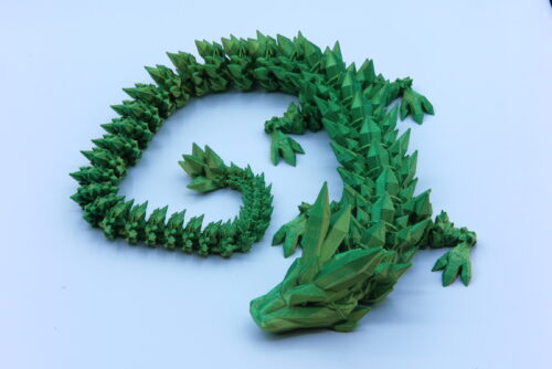 A Kristálysárkány 3D nyomtatással készült PLA-ból. Így bárhogyan kedvedre mozgathatod, azonban szét nem szerelhető.
